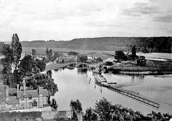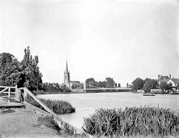 Вид Марло с берега ниже по течению (примерно на траверсе шлюза Марло). По центру видна башня церкви Всех Святых, а выше ее по течению подвесной мост через Темзу из Марло в Бишем. Сооружение слева — плотина, под которой располагалась купальня.
